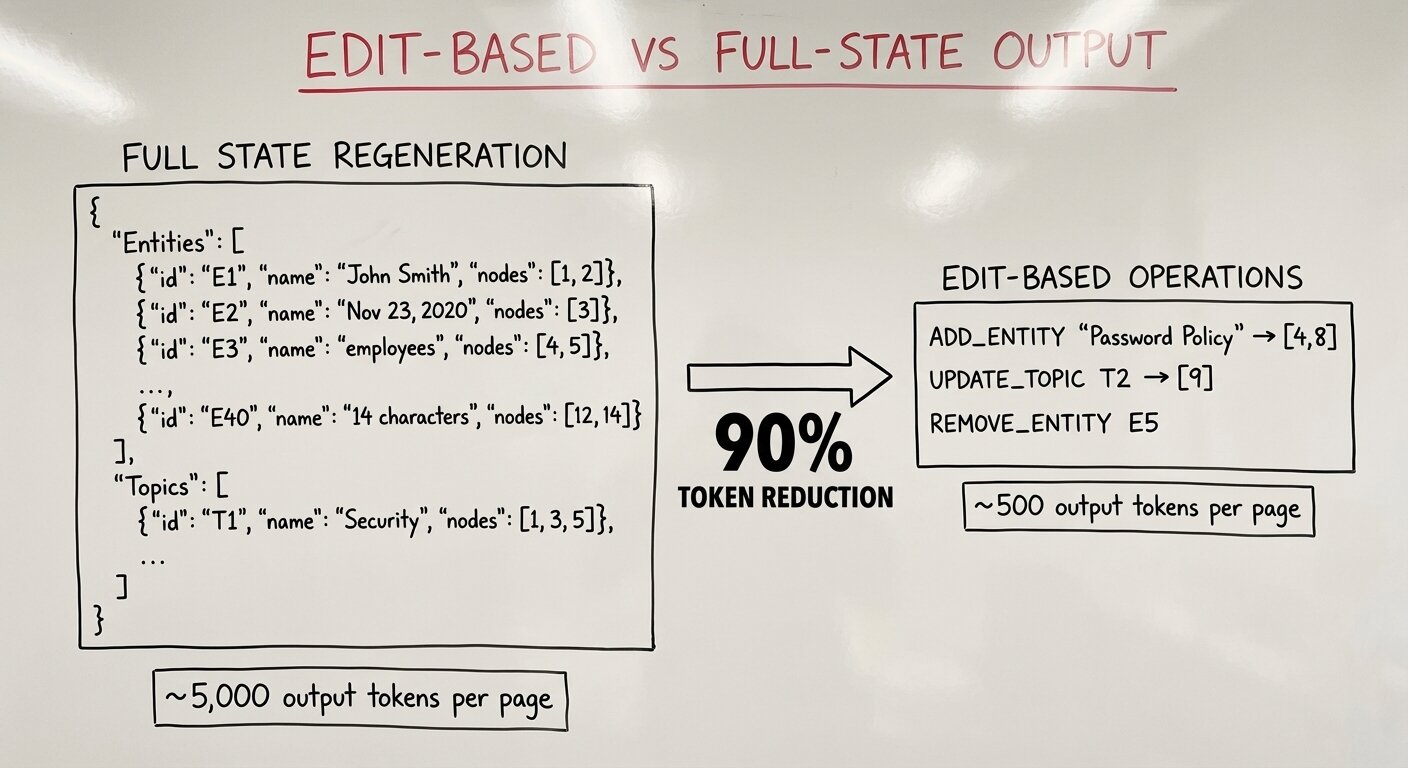Instead of regenerating all entities on every page, what if the model just said ADD_ENTITY "Password Policy" → [4], [8]? The state management happens in deterministic code; the LLM’s job is just to identify what’s semantically relevant. This “edit-based” approach cut output tokens by roughly 90%. Suddenly a 100-page document started to seem feasible.