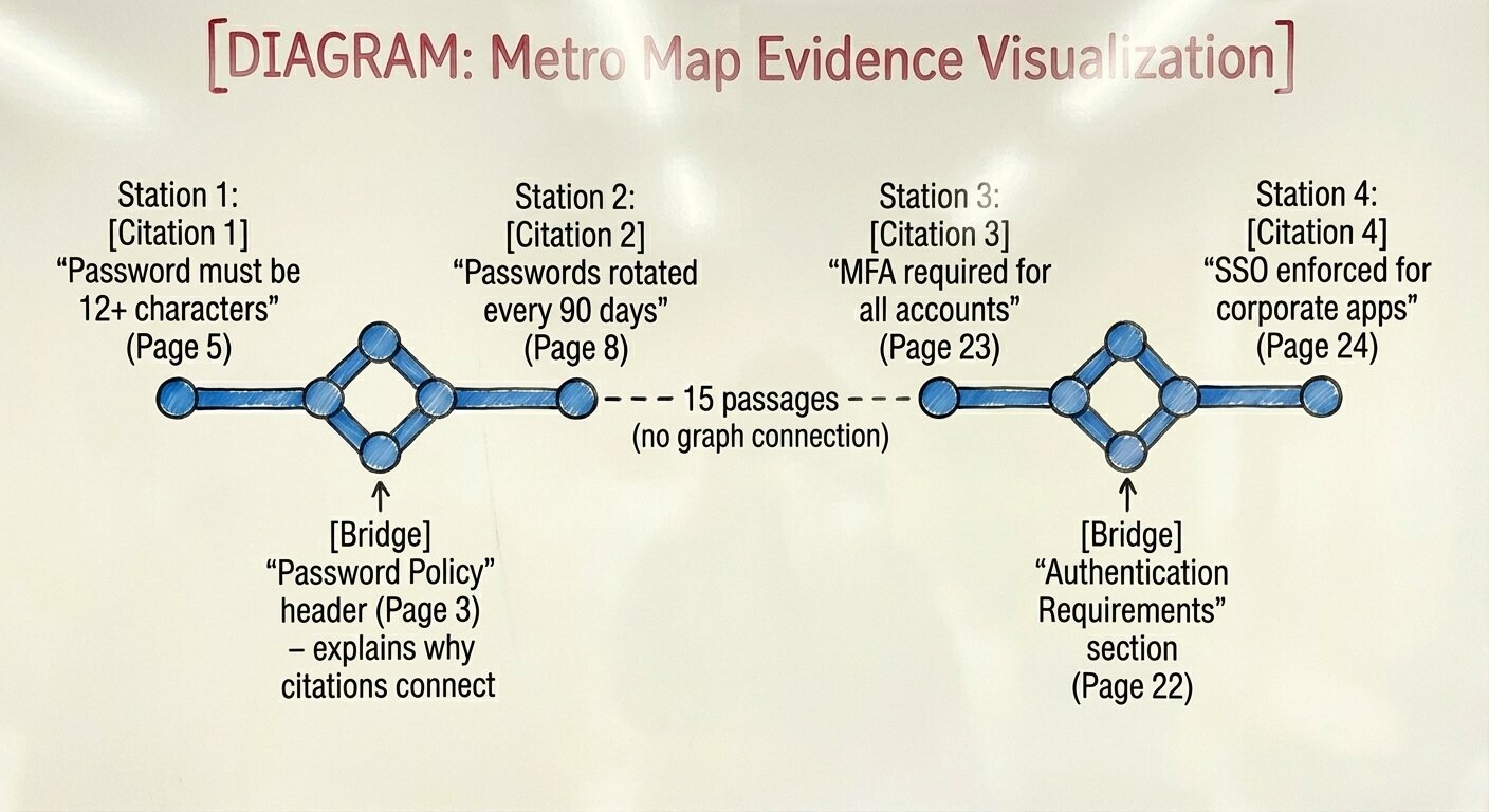 I designed a “Metro Map” visualization concept: evidence displayed in reading order with bridge nodes inserted inline between connected citations. Gaps show “N passages between” when citations aren’t graph-connected. The result is a linear narrative showing how the answer’s supporting evidence flows through the document, something ranked chunk lists can’t show.