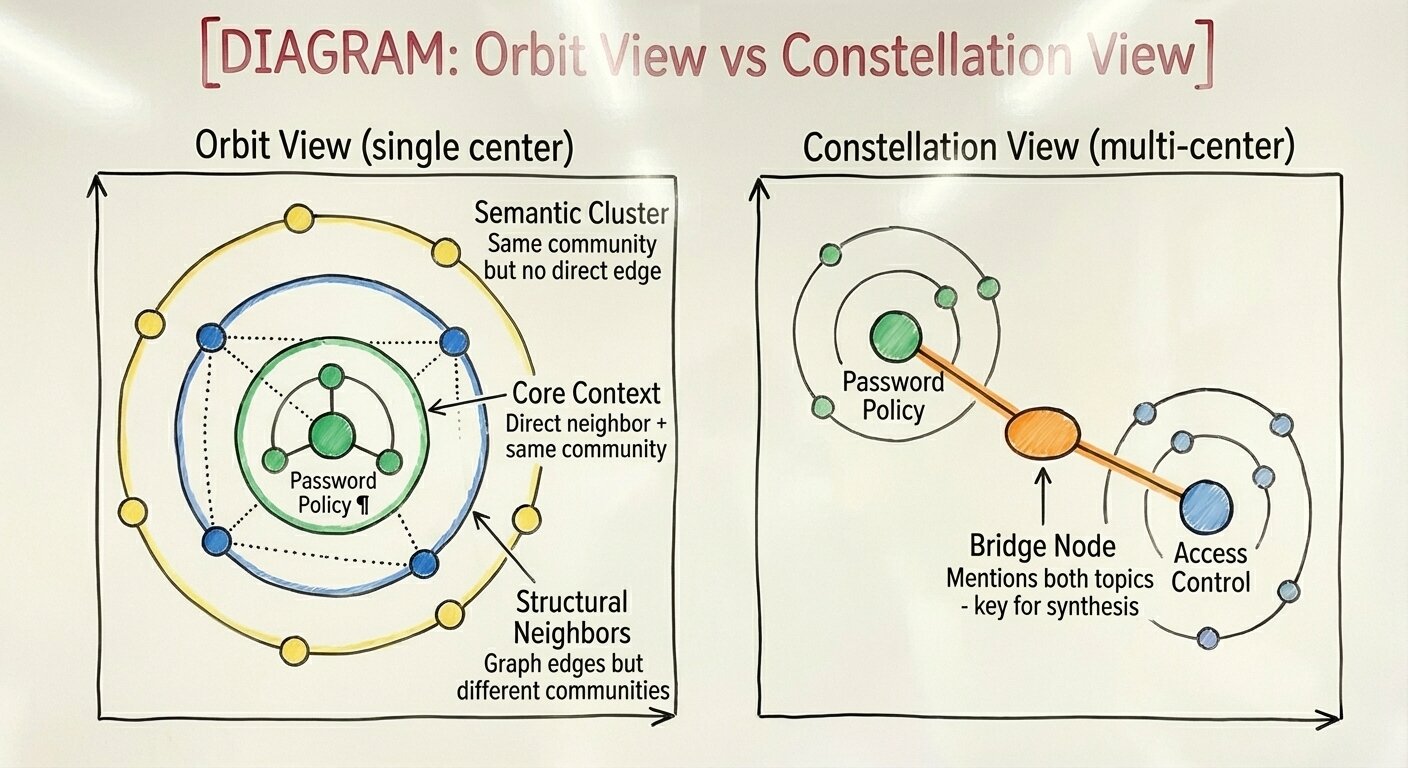 For multi-node contextualization (exploring 2–3 nodes together), I created a “constellation view.” This identifies bridge nodes, nodes connected to multiple centers, which are often the key for synthesis. If you’re exploring “Password Policy” and “Access Control” together, a bridge node mentioning both topics is extremely valuable.