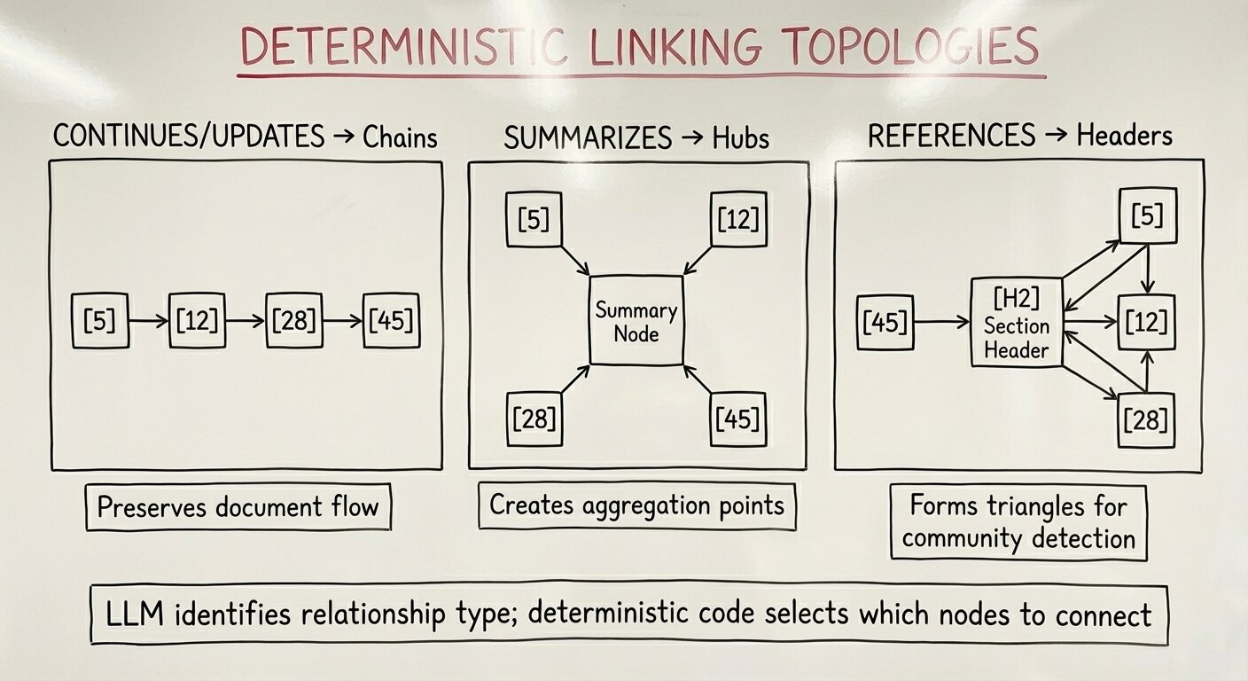 This “deterministic linking” strategy meant the LLM only needed to output from_index, relationship_type, and via_memory. No more target arrays to hallucinate. The schema shrank, saving ~1,000 tokens per page. More importantly, the graph topology became predictable: chains where content flows forward, hubs where summaries aggregate, and narrow references through section headers when available.