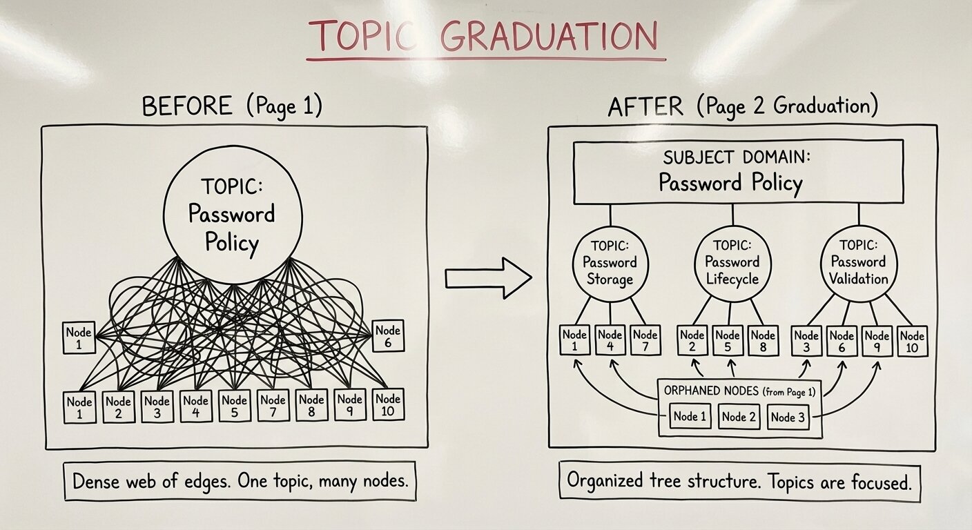 “Password Policy” graduates to a domain containing “Password Storage”, “Password Lifecycle”, “Password Validation” as distinct topics. Now when page 50 discusses password storage, it creates edges to just the storage-related nodes, not every password-policy-related node in the document.