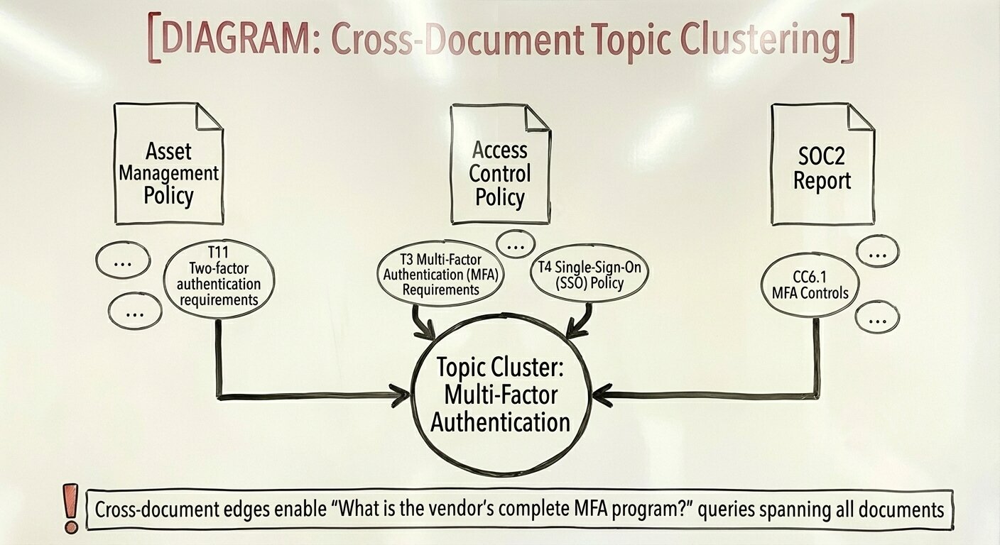 T11 in the first block and T3/T4 in the second block both address multi-factor authentication. When conducting a vendor security review, you likely want to connect “multi-factor authentication” across all documents added to the review to get a complete picture of the vendor’s MFA program. The LAD-RAG approach to constructing document graphs could be extended here where similar topics could be clustered across documents either during inference or before. During processing, discovered clusters could be analyzed by LLMs to create a complete picture of common themes across documents before inference even begins. I believe there are a lot of interesting features that could fall out of these extracted entities/topics etc.
